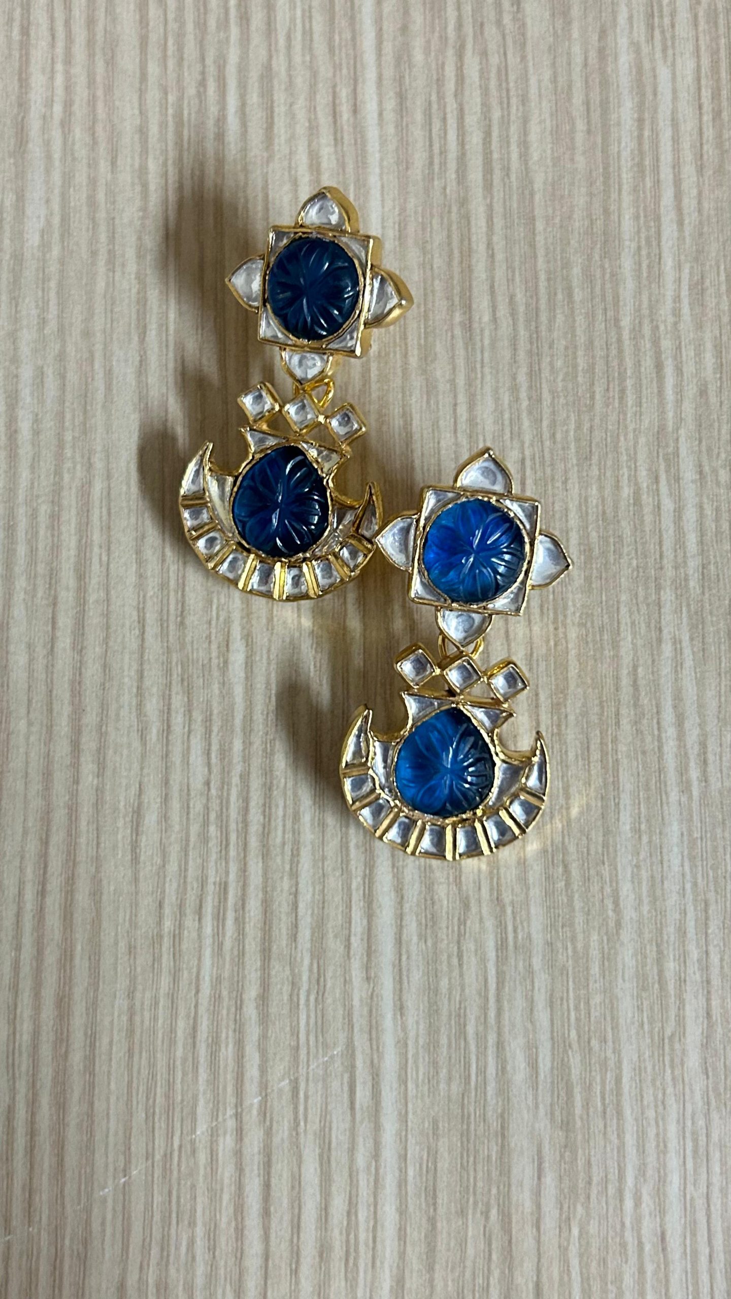 Featuring beautifully designed 925 silver Kundan necklace dressed with blue carving stones on each of the five pendants which are strung on a thread separated by blue Meenakari oval shaped units( dholki beads)and thread balls.